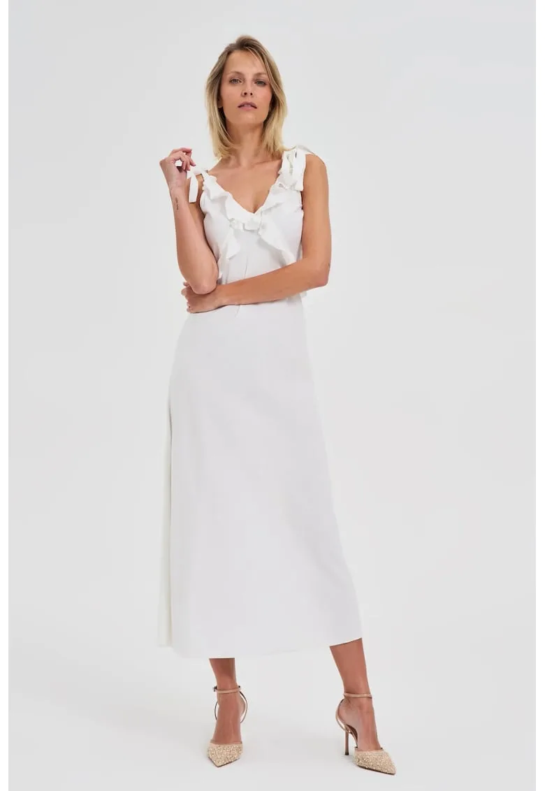 Rochie alba midi cu volanas la decolteu