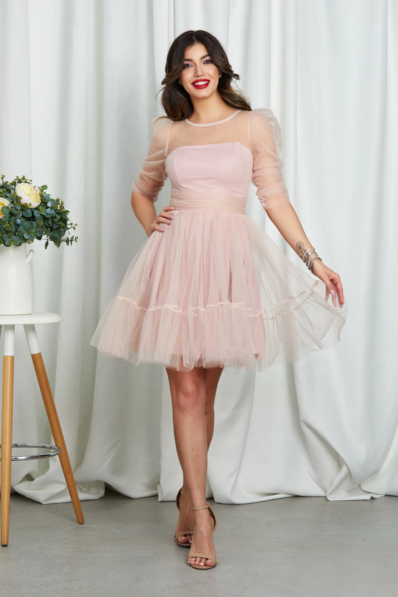 Rochie baby doll rose din tull, ideala tinutelor elegante si rafinate. Croiul deosebit si la moda, va face din aparitia ta, una super-feminina si de senzatie indiferent de ocazie. Cu rochia Baby Doll vei avea o tinuta wow la fiecare aparitie! material usor elastic se inchide cu fermoar si nasture bust neburetat jupon din licra cordon nedetasabil maneci trei sferturi Dimensiuni disponibile: S, M, L