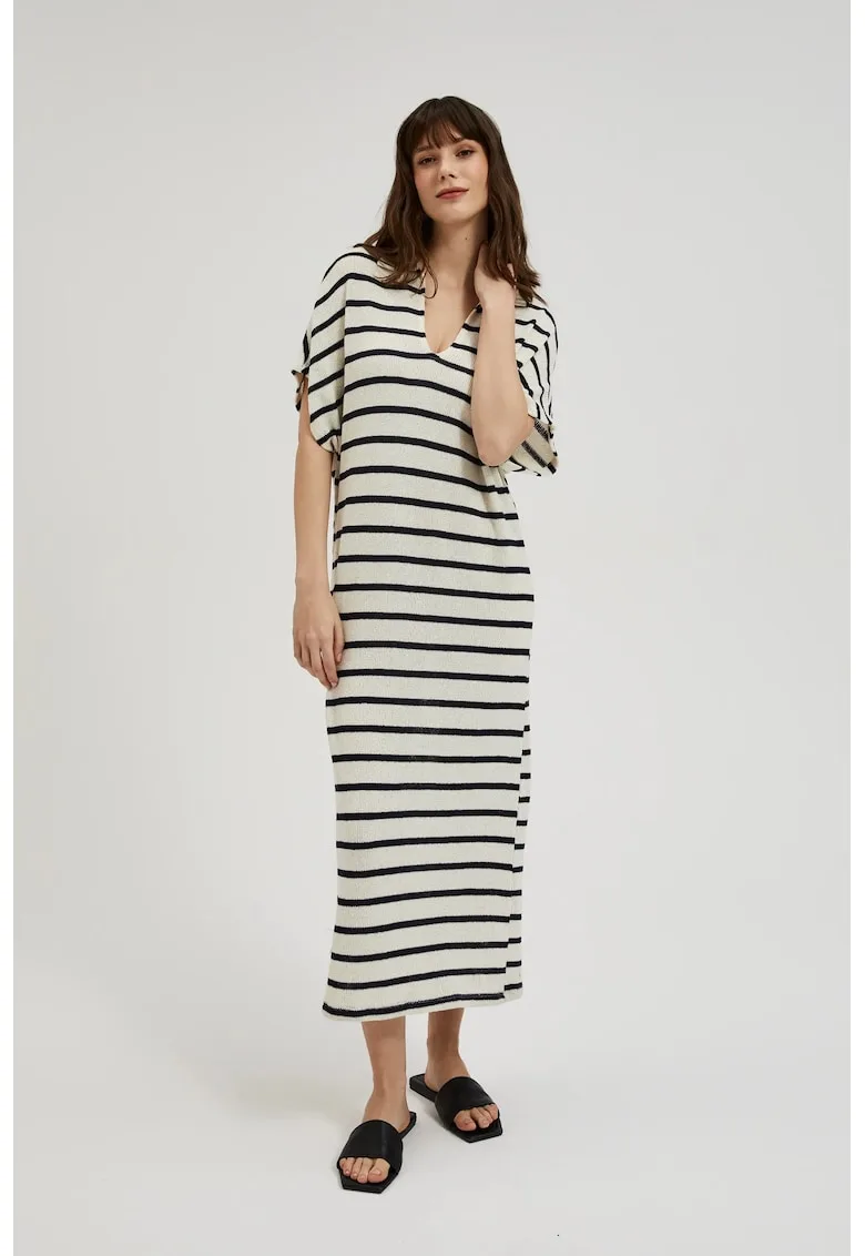 Rochie bej cu decolteu in V si dungi – Reduceri Exclusive