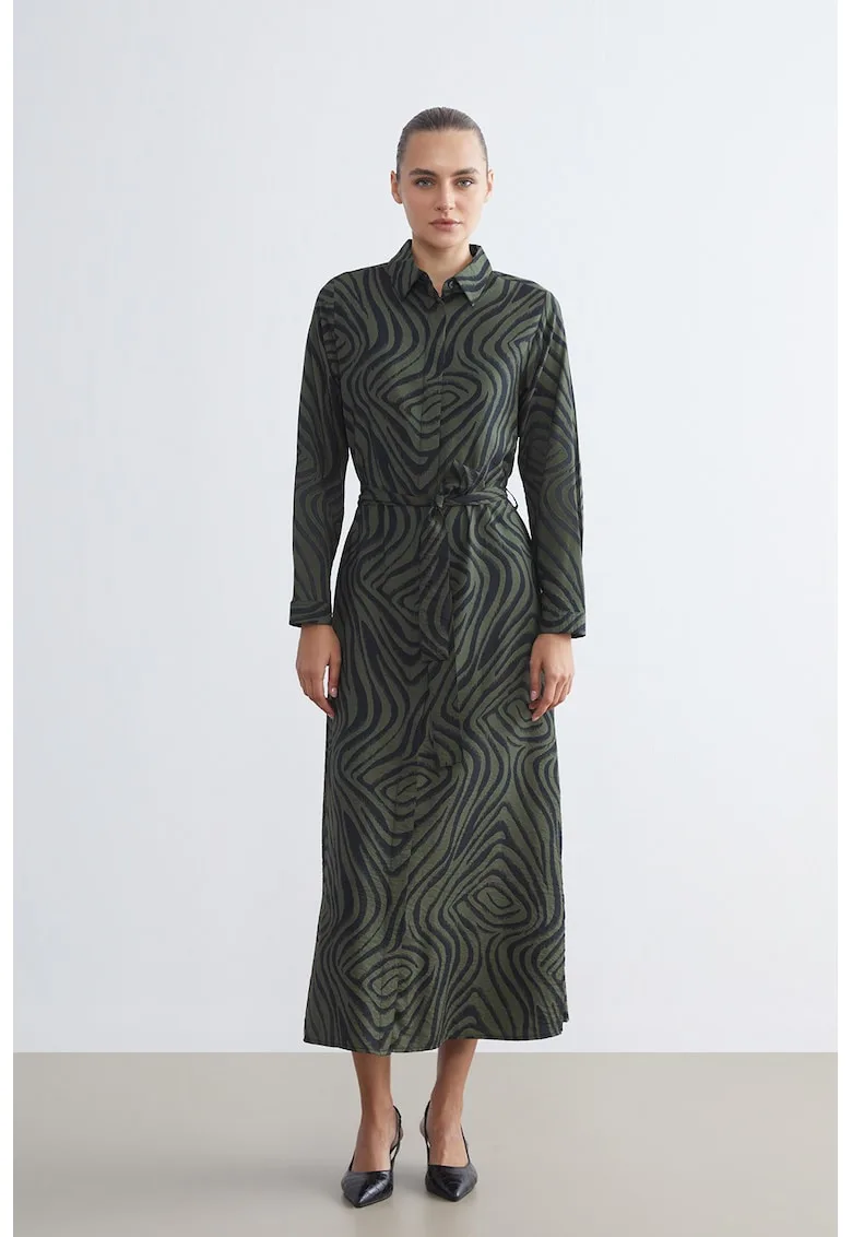 Caracteristici Culoare: verde inchis Stil: casual Material: viscoza – poliamida Imprimeu: dungi Croiala: dreapta Lungime: midi Guler: ascutit Lungime maneca: maneca lunga Sistem inchidere: nasturi Compozitie Exterior: 87% viscoza – 13% poliamida.