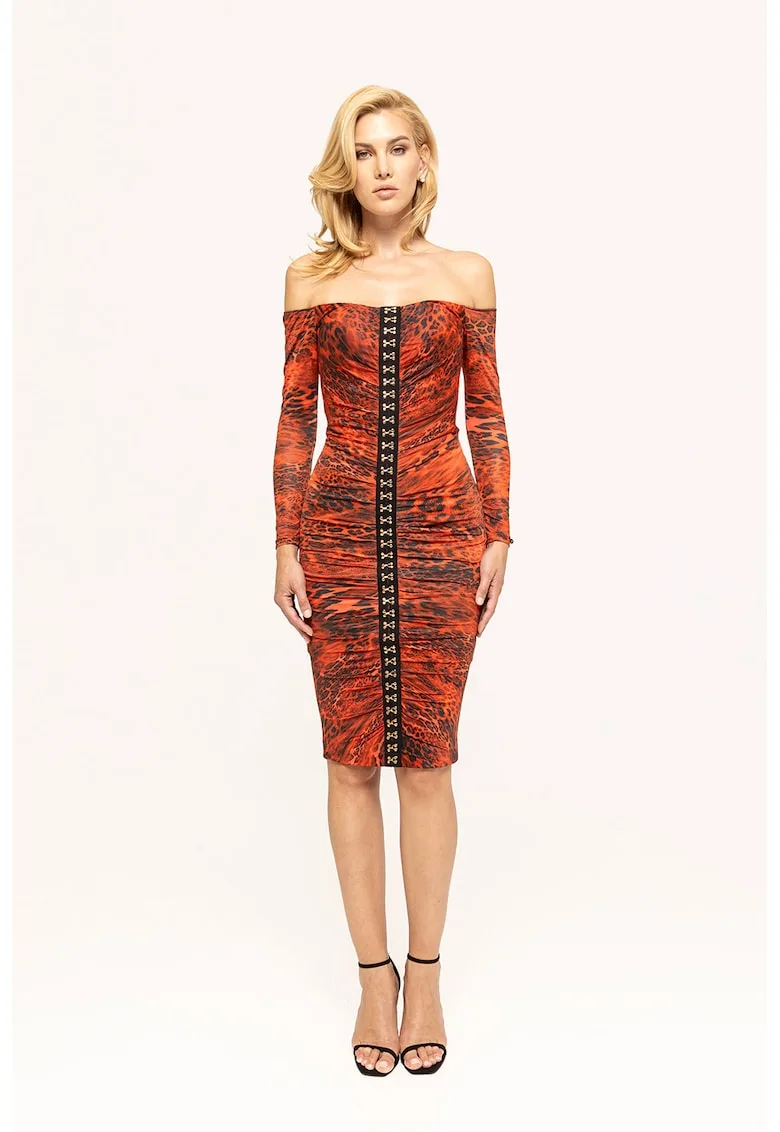 Rochie cambrata cu animal print si decolteu pe umeri – Reduceri Exclusive