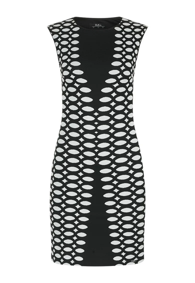 Caracteristici Culoare: negru Stil: elegant Material: viscoza Imprimeu: grafic Croiala: bodycon Lungime: scurta Decolteu: round Lungime maneca: fara maneca Compozitie Exterior: 81% poliester – 16% viscoza – 3% elastan Captuseala: 100% poliester.