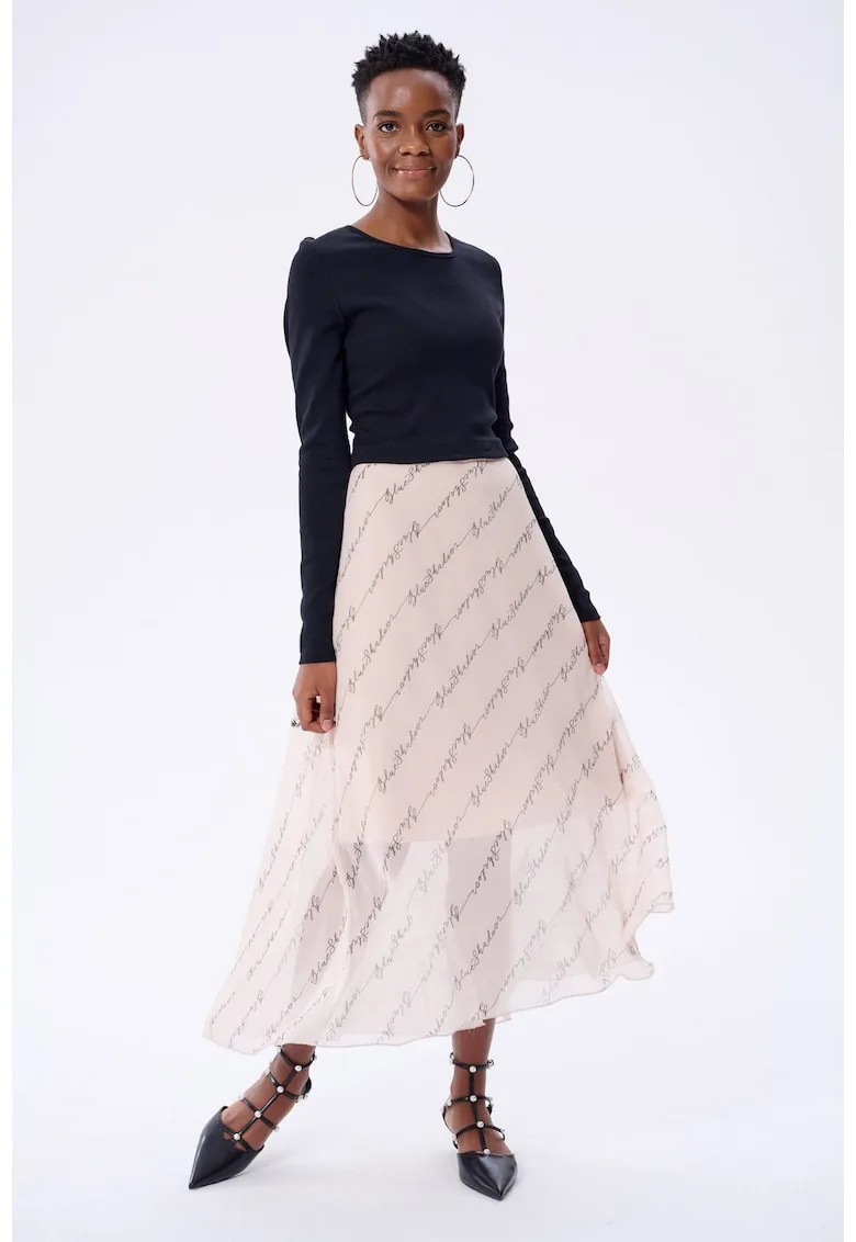 Caracteristici Culoare: negru – bej Stil: casual Material: sintetic – bumbac Imprimeu: uni Croiala: evazat Lungime: midi Decolteu: rotund Maneci: lungi Lungime maneca: maneca lunga Talie: inalta Detalii: aspect 2 in 1 Sistem inchidere: fara inchidere Compozitie Exterior: 92% bumbac – 8% elastan Material garnituri: 92% bumbac – 8% elastan.