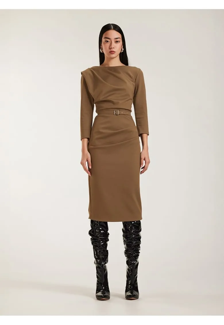 Caracteristici Culoare: maro deschis Stil: elegant Material: viscoza Imprimeu: uni Croiala: bodycon Lungime: midi Decolteu: rotund Lungime maneca: maneca lunga Talie: cu o curea din material textil Detalii: design drapat Sistem inchidere: fermoar Compozitie Exterior: 50% viscoza – 43% poliamida – 7%elastan Captuseala: 100% bambus.