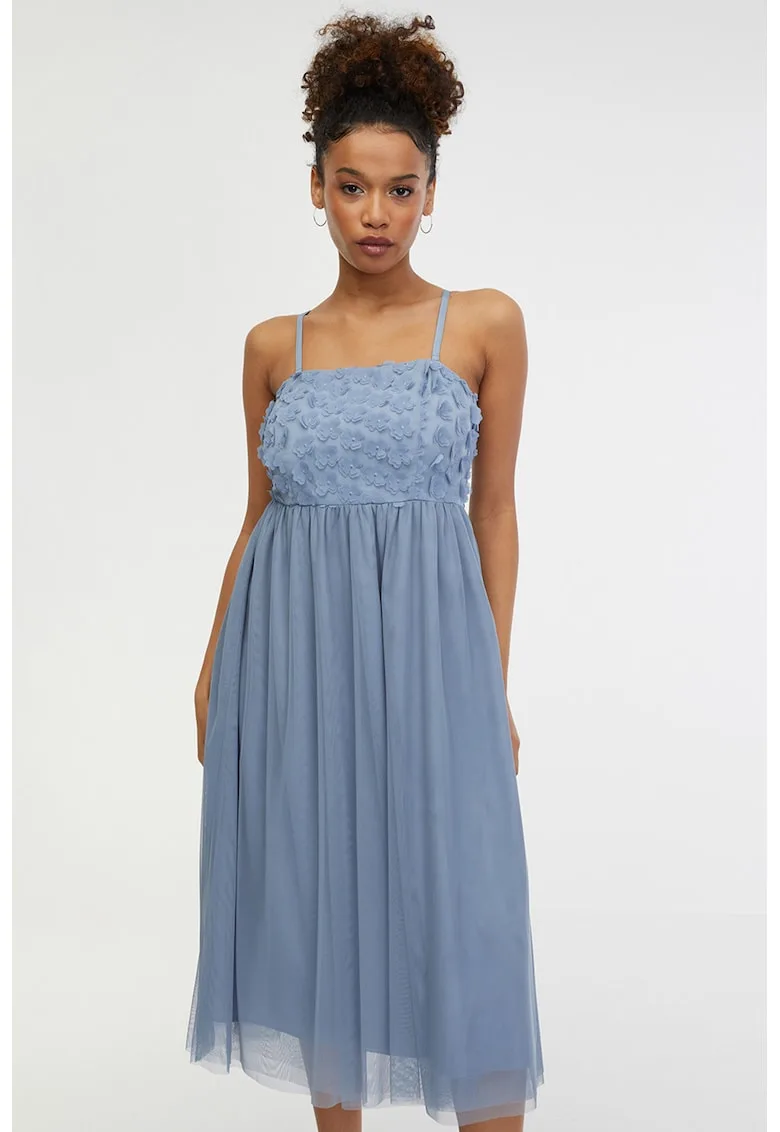 Caracteristici Culoare: albastru prafuit Stil: elegant Material: poliester Imprimeu: uni Croiala: empire Lungime: midi Decolteu: patrat Barete: ajustabile – inguste Lungime maneca: fara maneca Detalii: aplicatii florale 3d Compozitie Exterior: 100% poliester.