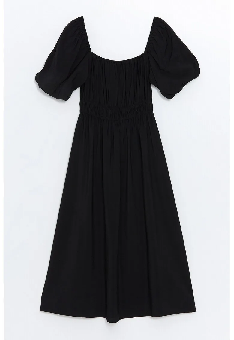 Caracteristici Culoare: negru Stil: casual Material: viscoza – poliamida Imprimeu: uni Croiala: evazat Lungime: midi Decolteu: patrat Lungime maneca: maneca scurta Sistem inchidere: fara inchidere Compozitie Exterior: 84% viscoza – 16% poliamida.