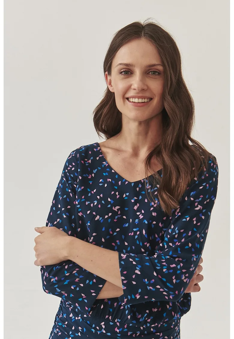 Caracteristici Culoare: roz deschis – bleumarin Stil: casual Material: viscoza Imprimeu: grafic Croiala: evazat Lungime: midi Decolteu: in v Lungime maneca: maneca trei sferturi Compozitie Exterior: 100% viscoza Captuseala: 100% viscoza.