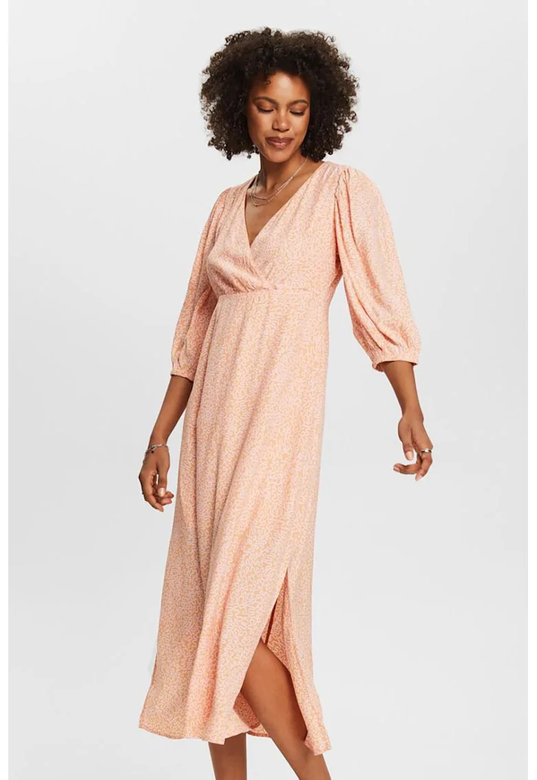 Caracteristici Culoare: portocaliu pal Stil: casual Material: viscoza Imprimeu: grafic Croiala: evazat Lungime: midi Decolteu: cache-coeur Maneci: bufante Lungime maneca: maneca medie Detalii: slituri laterale Compozitie Exterior: 100% viscoza.