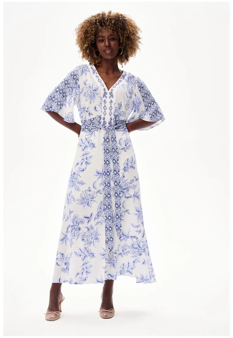 Caracteristici Culoare: alb – albastru royal Stil: casual Material: viscoza Imprimeu: floral Croiala: evazat Lungime: lunga Decolteu: in v Maneci: fluture Lungime maneca: maneca scurta Talie: inalta Detalii: cordon in talie Sistem inchidere: fara inchidere Compozitie Exterior: 98% viscoza – 2% elastan.
