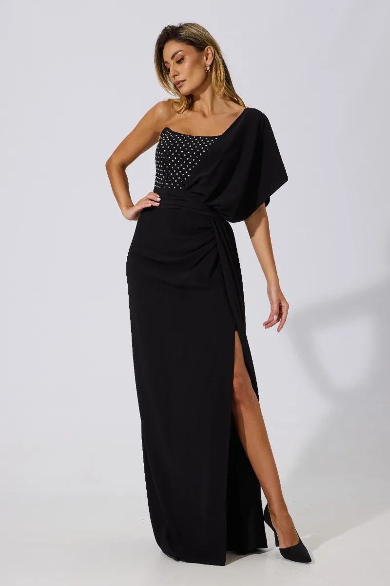 Rochie lunga de ocazie neagra accesorizata cu strass-uri in partea superioara  are un design de efect ce te va situa in centrul atentiei. Este tinuta in care vei capta toate privirile la evenimentul tau. material usor elastic fermoar la spate bust buretat tip one shoulder accesorizata cu strass-uri in partea superioara crepeu in fata dublata de jupon Dimensiuni disponibile: S, M, L, XL