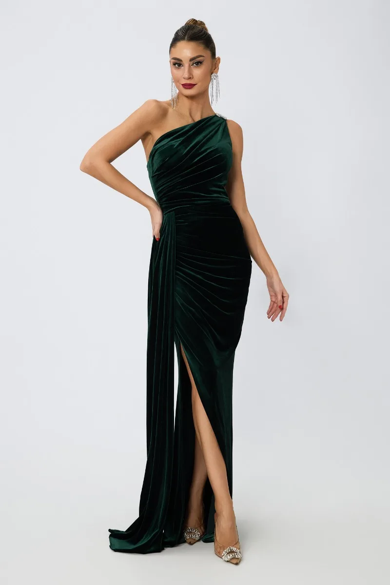 Descoperă rochia perfectă pentru evenimente speciale! Cumpără Rochie de ocazie din catifea one shoulder cu strass-uri Terezia Verde acum de la Zonia și profită de oferta limitată!