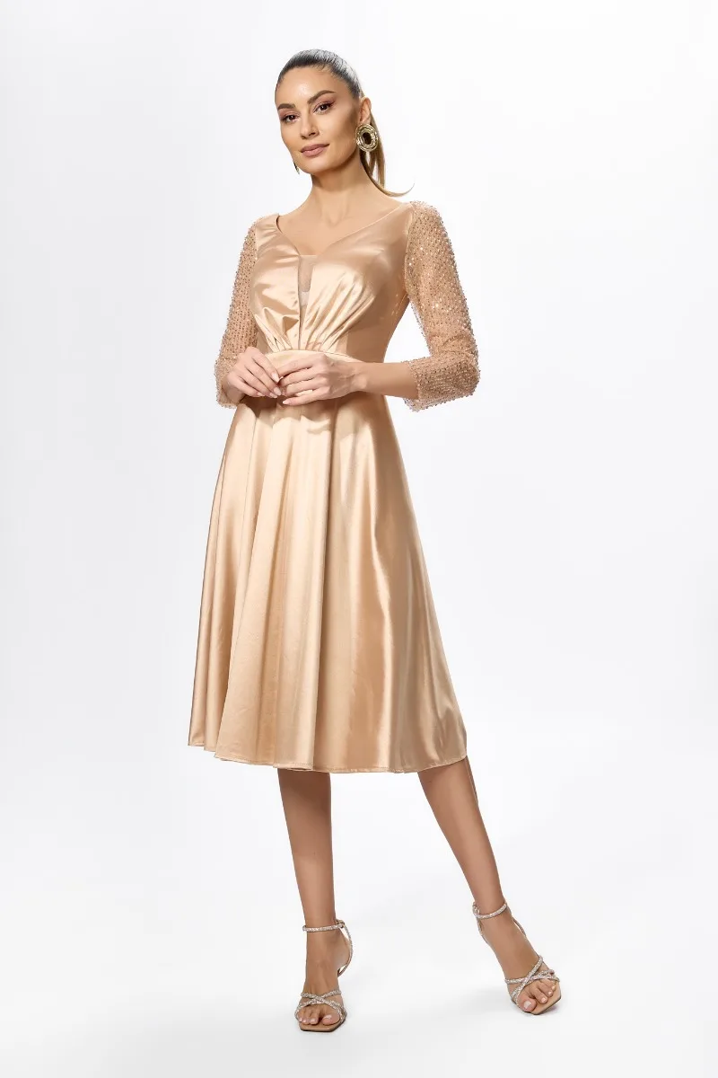 Rochie de ocazie din licra satinat cu paiete pe maneci Maura Aurie – Reduceri Exclusive