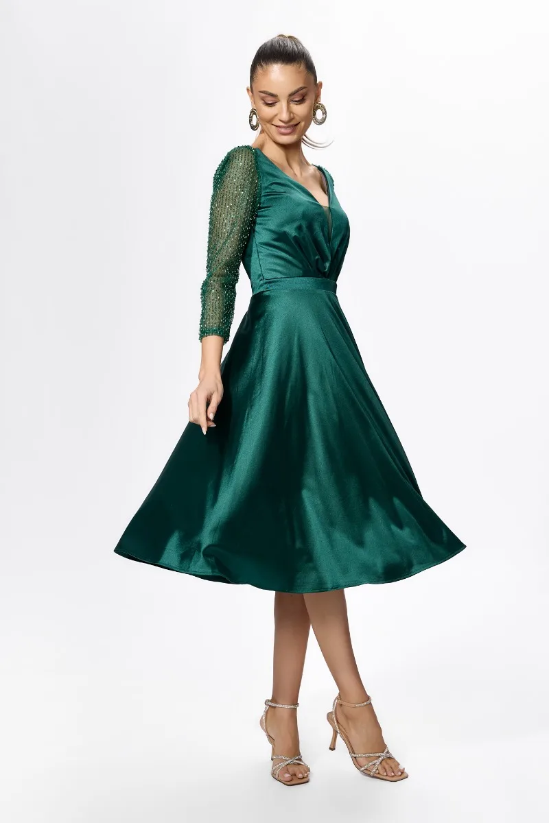 Rochie de ocazie din licra satinat cu paiete pe maneci Maura Verde