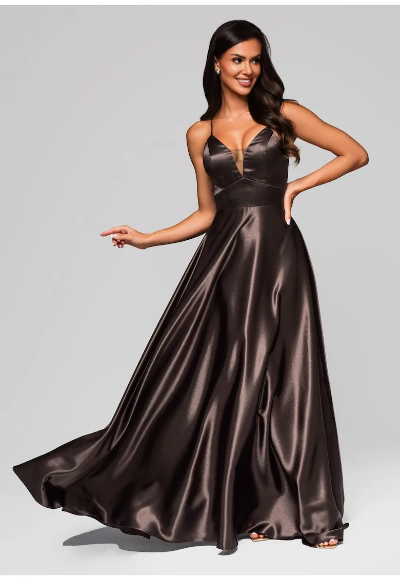 Caracteristici Culoare: maro Stil: elegant Material: poliester Imprimeu: uni Croiala: in a Lungime: lunga Lungime maneca: fara maneca.