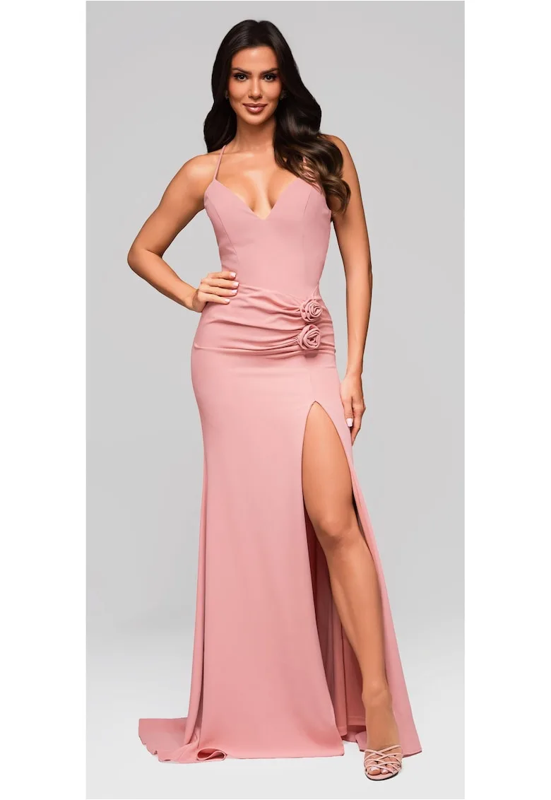 Caracteristici Culoare: roz deschis Stil: elegant Material: poliester Imprimeu: uni Croiala: curvy Lungime: lunga Lungime maneca: fara maneca.