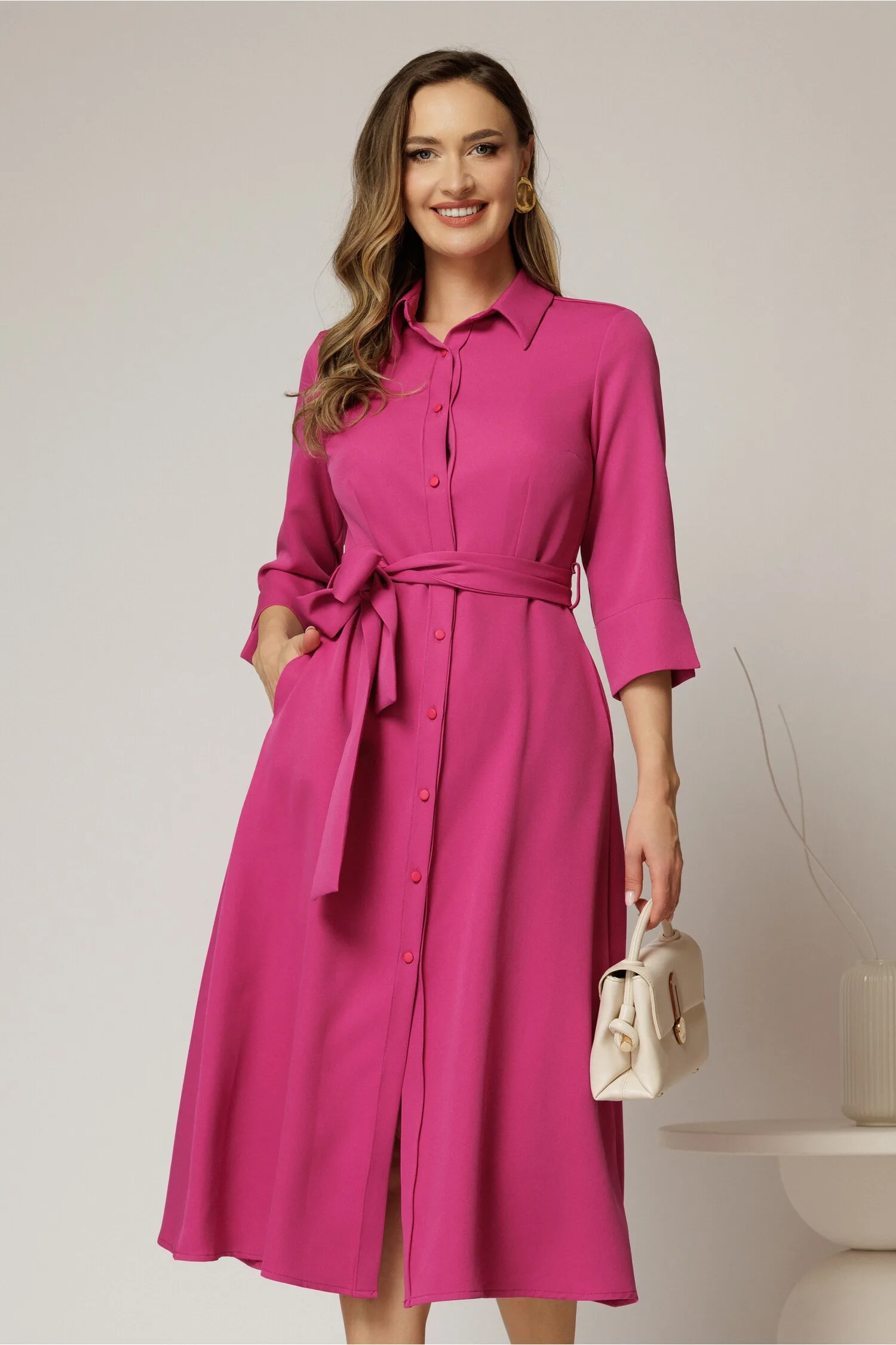 Este o rochie midi tip camasa fucsia, cu inchidere cu nasturi si cordon in talie. Rochia are maneci trei sferturi si croiul clos. rochie midi fucsia croi clos tip camasa inchidere cu nasturi cordon in talie maneci trei sferturi Material: stofa barbie Compozitie: 97% poliester, 3% elastan Fotomodelul poartă mărimea: S | Înălțime: 174 cm Fiecare produs este măsurat individual. Te rugăm să consulți ghidul de mărimi pentru alegerea corectă a mărimii!