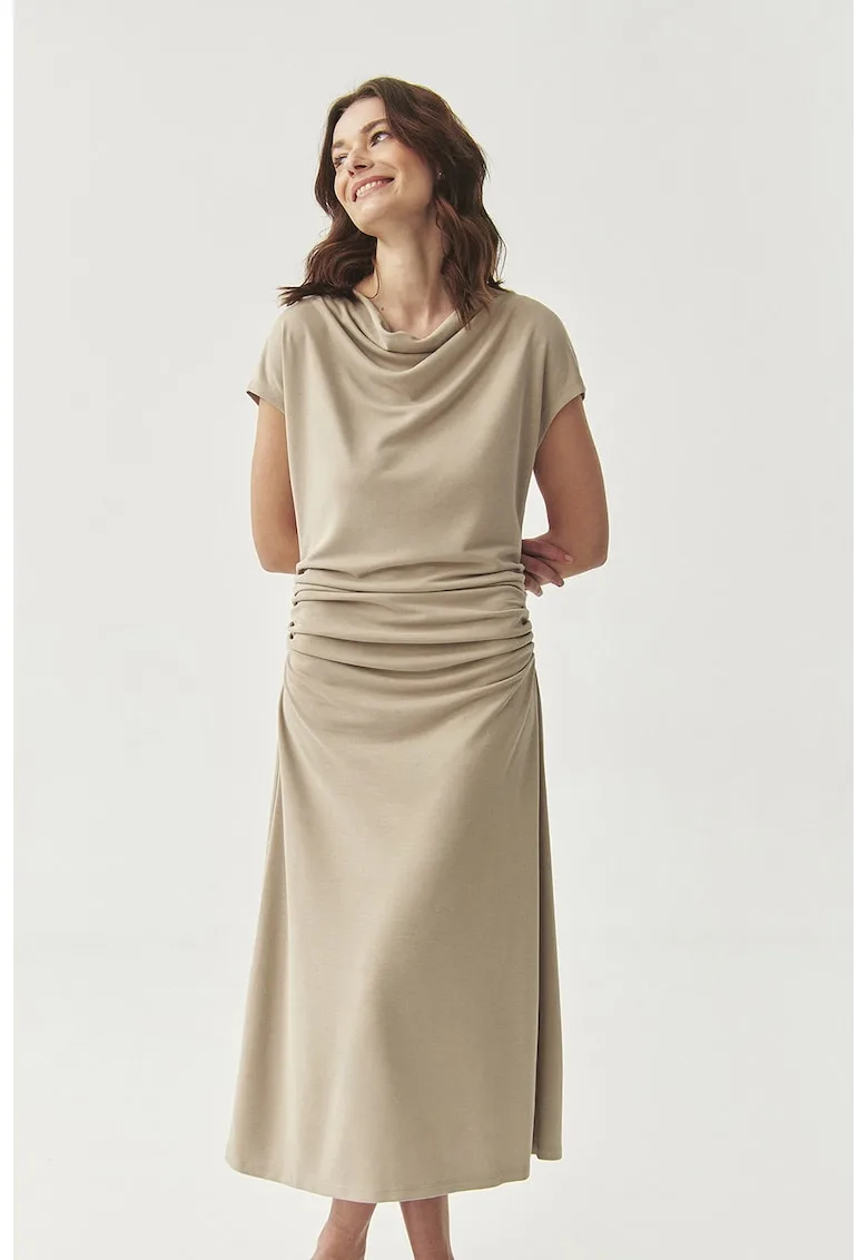 Caracteristici Culoare: bej deschis Stil: casual Material: sintetic – viscoza – modal Imprimeu: uni Croiala: evazat Lungime: midi Decolteu: drapat Lungime maneca: maneca scurta Sistem inchidere: fara inchidere Compozitie Exterior: 52% modal – 29% poliester – 19% viscoza.