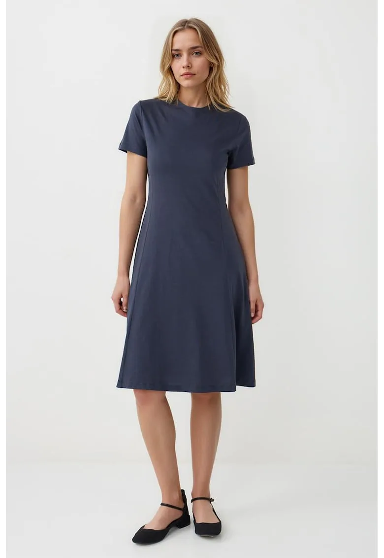 Caracteristici Culoare: bleumarin Stil: casual Material: bumbac Imprimeu: uni Croiala: pe bie Lungime: midi Decolteu: rotund Lungime maneca: maneca scurta Compozitie Exterior: 100% bumbac.