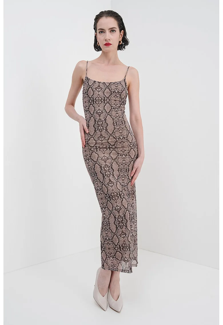 Caracteristici Culoare: maro inchis – maro Stil: casual Material: poliester Imprimeu: animal print Croiala: dreapta Lungime: lunga Decolteu: patrat Lungime maneca: fara maneca Compozitie Exterior: 95% poliester reciclat – 5% elastan Info model Modelul poarta un produs de marimea S. Marimi model: 174 cm inaltime – 83 cm bust – 59 cm talie – 88 cm sold.