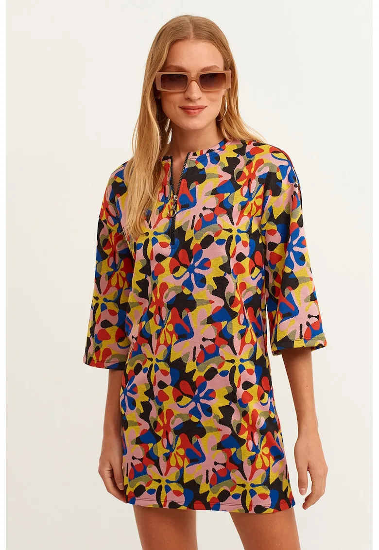 Caracteristici Culoare: multicolor Stil: casual Material: poliester – viscoza – elastan Imprimeu: abstract Croiala: dreapta Lungime: scurta Decolteu: rotund Lungime maneca: maneca medie Detalii: fenta scurta cu fermoar Compozitie Exterior: 76% poliester – 23% viscoza – 1% elastan.