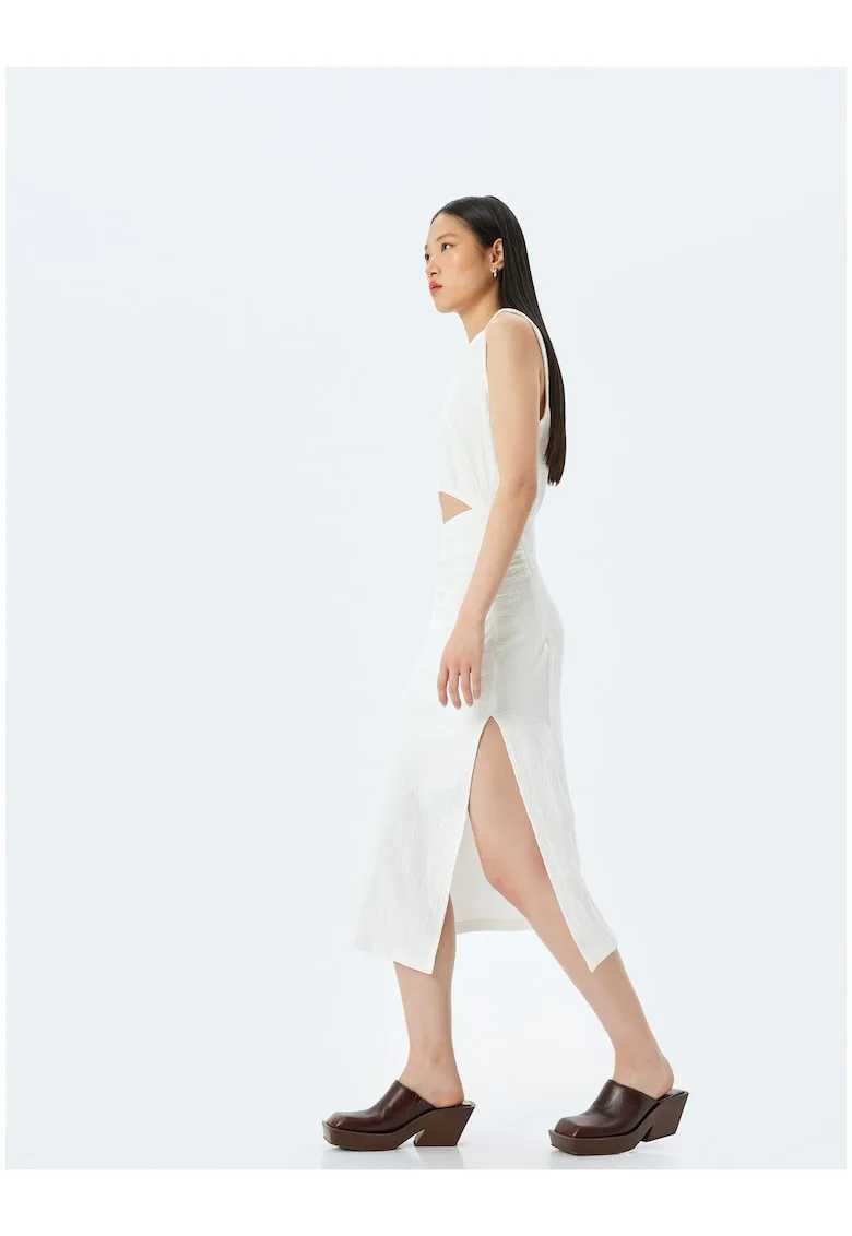Caracteristici Culoare: alb murdar Stil: casual Material: bumbac Imprimeu: uni Croiala: dreapta Lungime: midi Decolteu: rotund Lungime maneca: fara maneca Detalii: decupaje – slit lateral la terminatie Compozitie Exterior: bumbac.