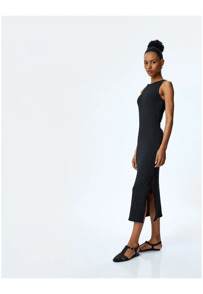 Caracteristici Culoare: negru Stil: casual Material: sintetic Imprimeu: uni Croiala: dreapta Lungime: lunga Decolteu: la baza gatului Lungime maneca: fara maneca Detalii: aspect texturat Sistem inchidere: fara inchidere Compozitie Exterior: elastan – poliester.