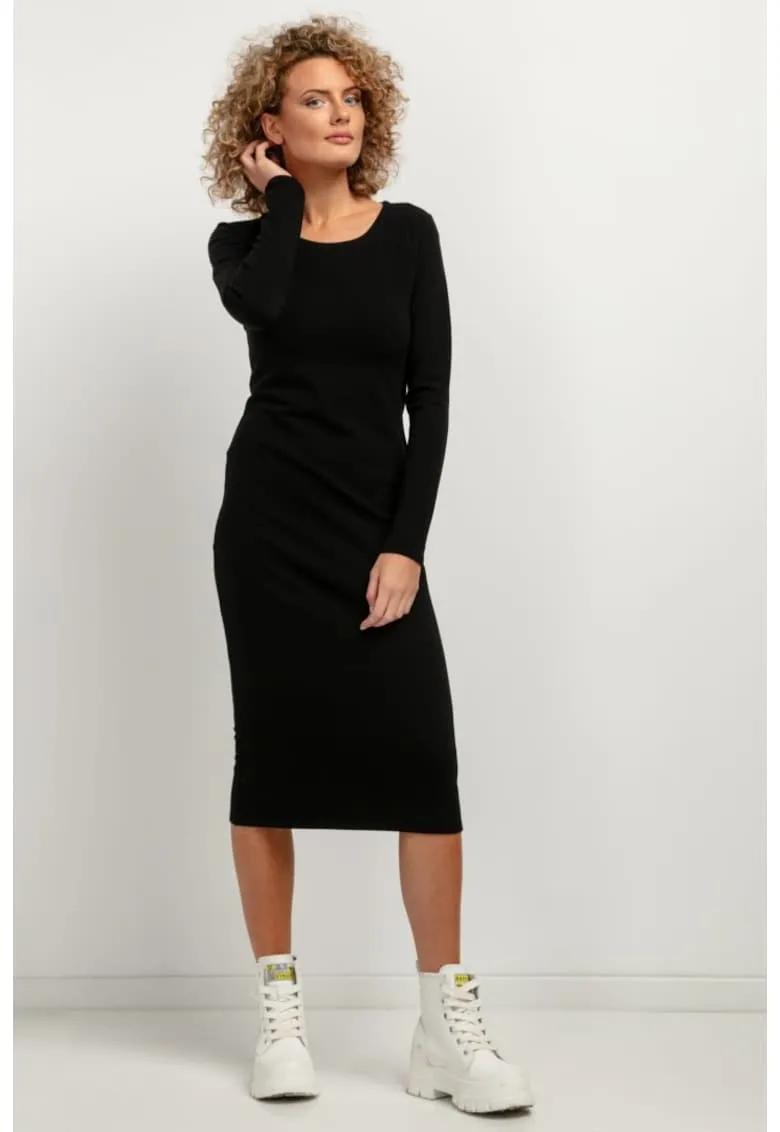 Caracteristici Culoare: negru Stil: casual Material: bumbac – elastan Imprimeu: uni Croiala: dreapta Lungime: midi Decolteu: rotund Lungime maneca: maneca lunga Sistem inchidere: fara inchidere Compozitie Exterior: 95% bumbac – 5% elastan.