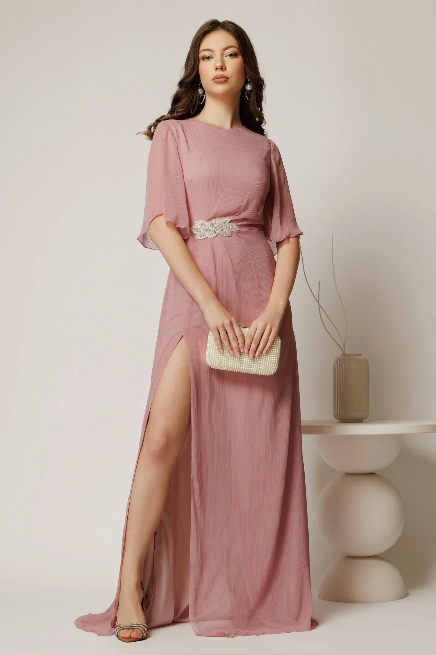 Rochie DY Fashion lunga roz de seara din voal cu aplicatie pe talie – Reduceri Exclusive