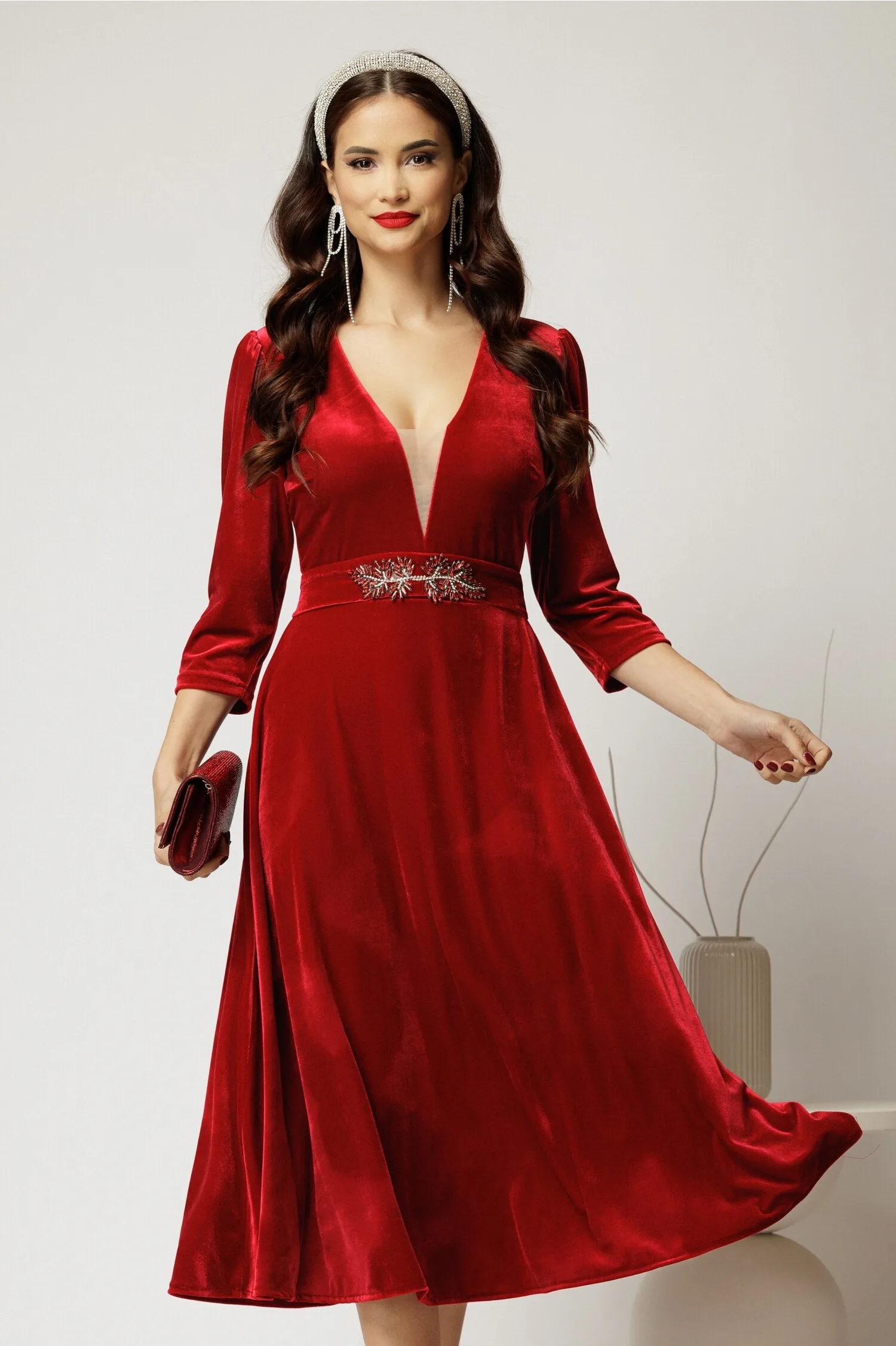 Descoperă rochia perfectă pentru evenimente speciale! Cumpără Rochie DY Fashion rosie din catifea cu decolteu adanc si cordon cu aplicatii acum de la DyFashion și profită de oferta limitată!