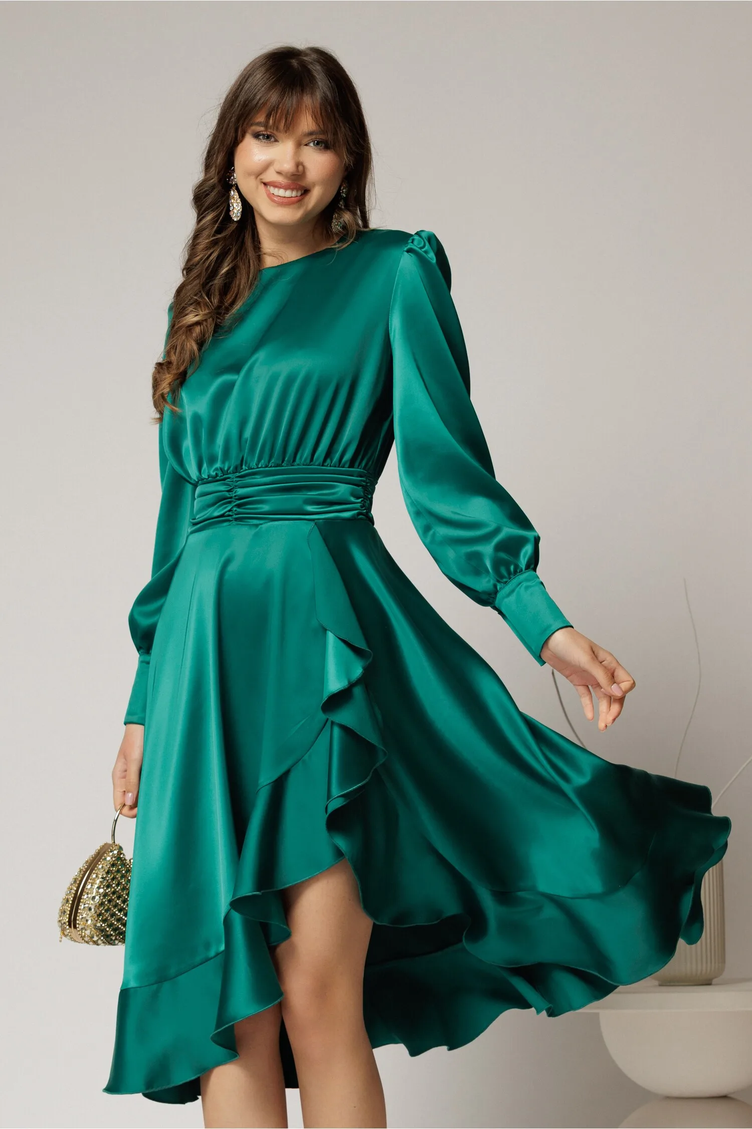 Este o rochie eleganta din satin verde, cu maneci lungi si croi asimetric. Decolteul rochiei este rotund, iar mansetele se inchid cu nasturi imbracati in tesatura. rochie midi verde croi asimetric mansete inchise cu nasturi imbracati cu volanase pe fusta inchidere cu fermoar la spate fara captuseala Material: satin plin Compozitie: 96% poliester, 4% spandex Fotomodelul poartă mărimea: S | Înălțime: 174 cm Fiecare produs este măsurat individual. Te rugăm să consulți ghidul de mărimi pentru alegerea corectă a mărimii!