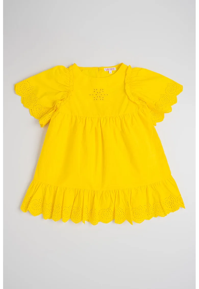 Caracteristici Culoare: galben pai Stil: casual Material: bumbac Imprimeu: uni Croiala: evazat Lungime maneca: maneca scurta Stil decolteu: rotund Detalii: cu decupaj keyhole pe partea din spate – detaliu perforat Colectie: primavara – vara Compozitie Exterior: 100% bumbac.