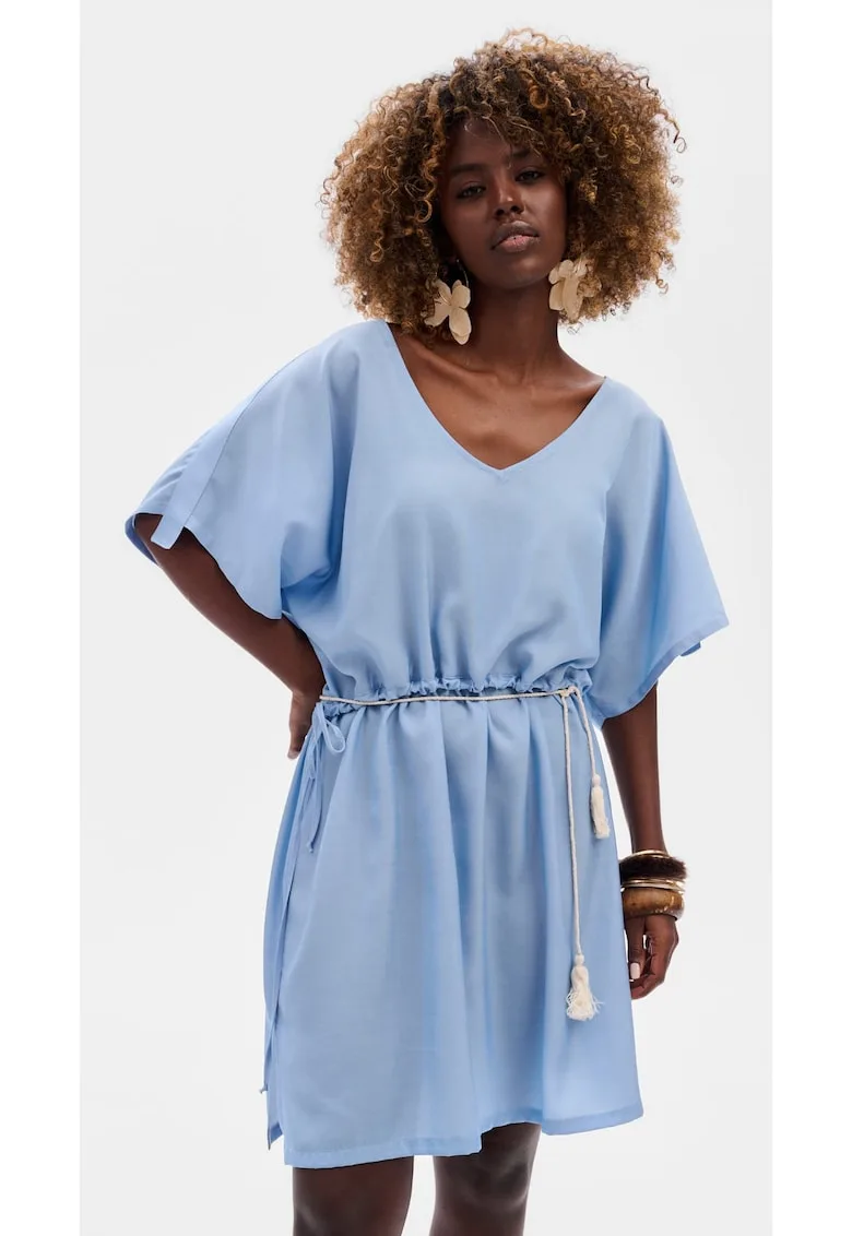 Caracteristici Culoare: albastru deschis Stil: casual Material: viscoza Imprimeu: uni Croiala: lejer Lungime: scurta Decolteu: in v Lungime maneca: maneca scurta Talie: ajustabila cu snur Detalii: decupaj pe partea din spate Sistem inchidere: fara inchidere Compozitie Exterior: 50% viscoza – 50% poliester.