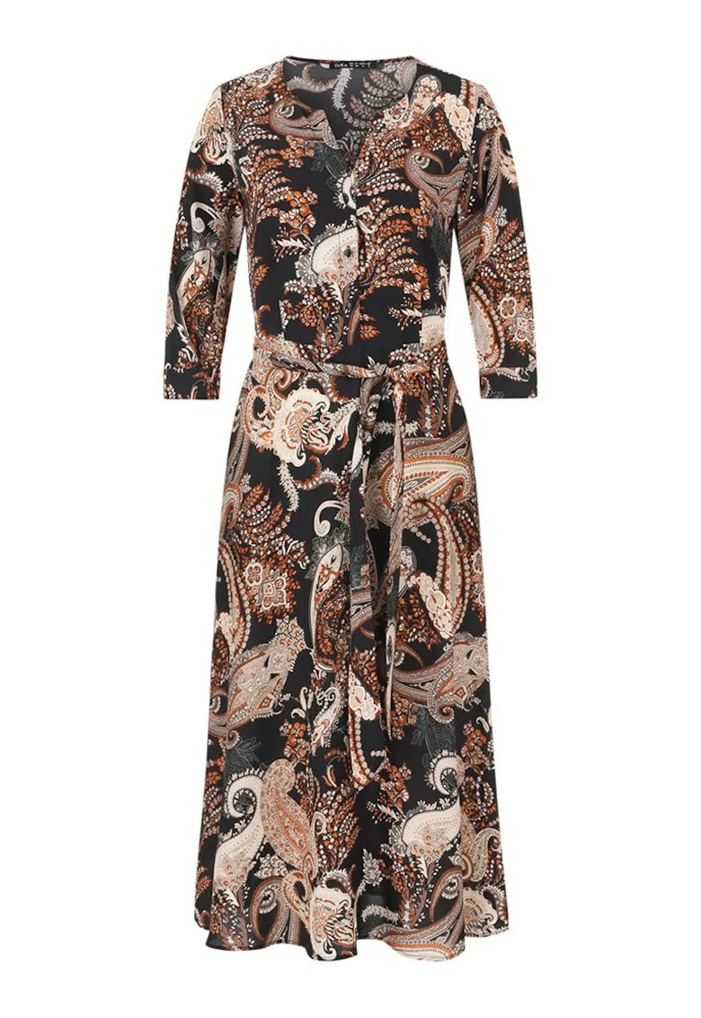 Caracteristici Culoare: negru Stil: elegant Material: viscoza Imprimeu: paisley Croiala: evazat Lungime: midi Decolteu: v Lungime maneca: maneca trei sferturi Sistem inchidere: nasturi Compozitie Exterior: 100% viscoza.