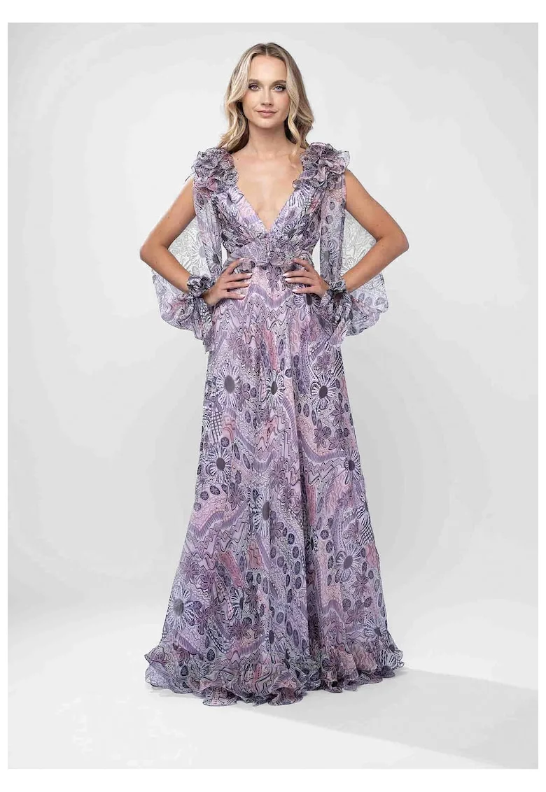 Rochie lunga din voal de matase cu imprimeu si volane dramatice