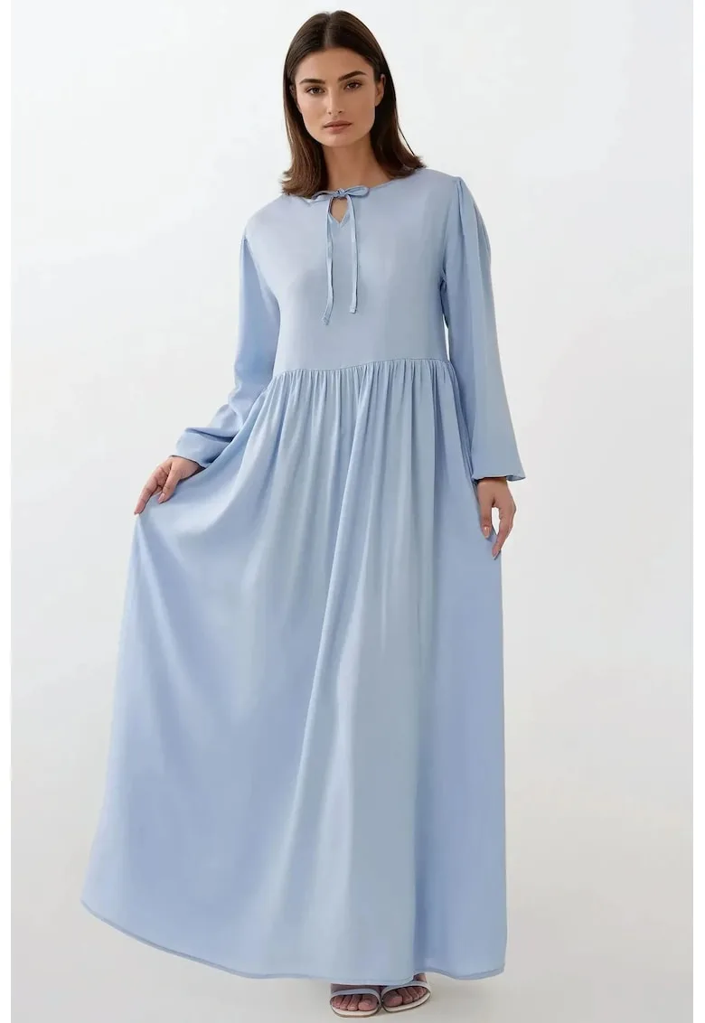 Rochie maxi – croiala in A – guler rotund – albastru – textil – Reduceri Exclusive