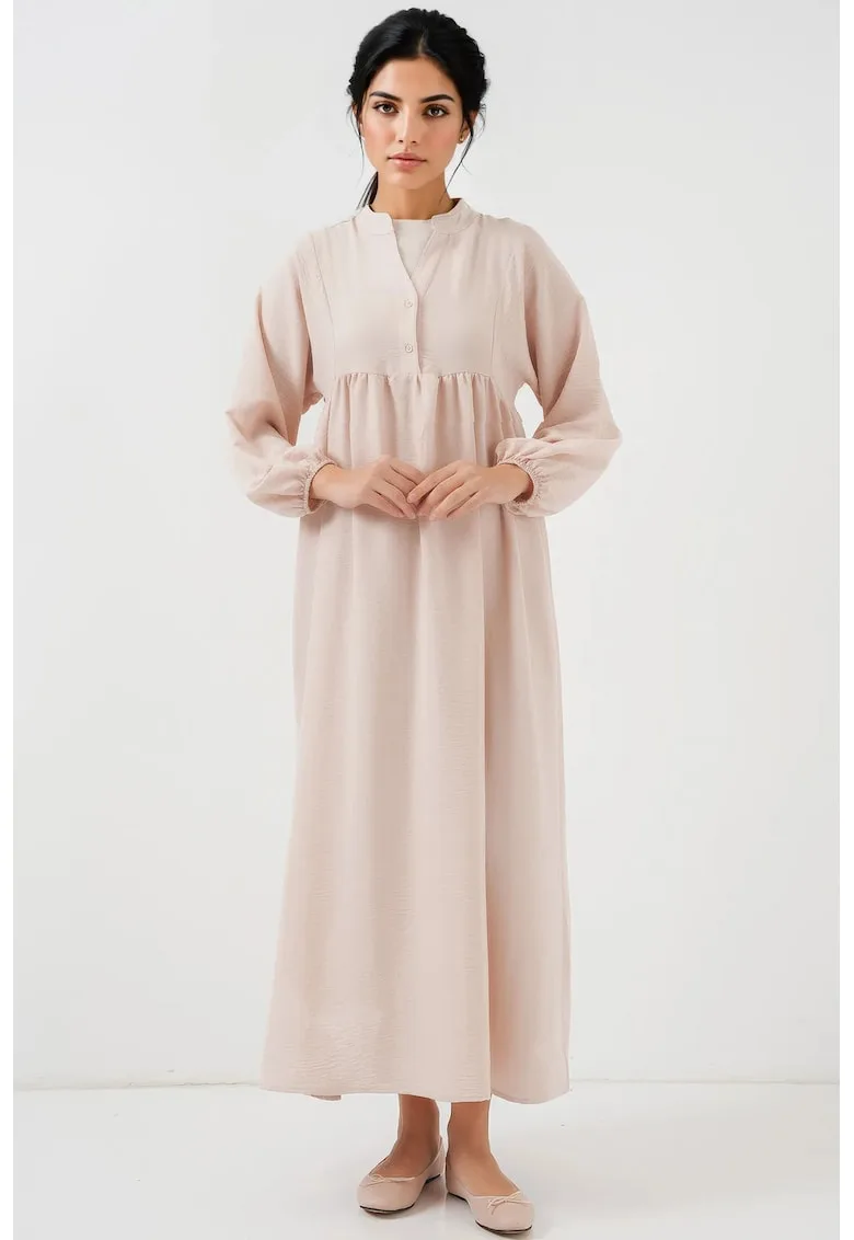Rochie maxi dama – poliester – decolteu in V si nasturi – bej – Reduceri Exclusive