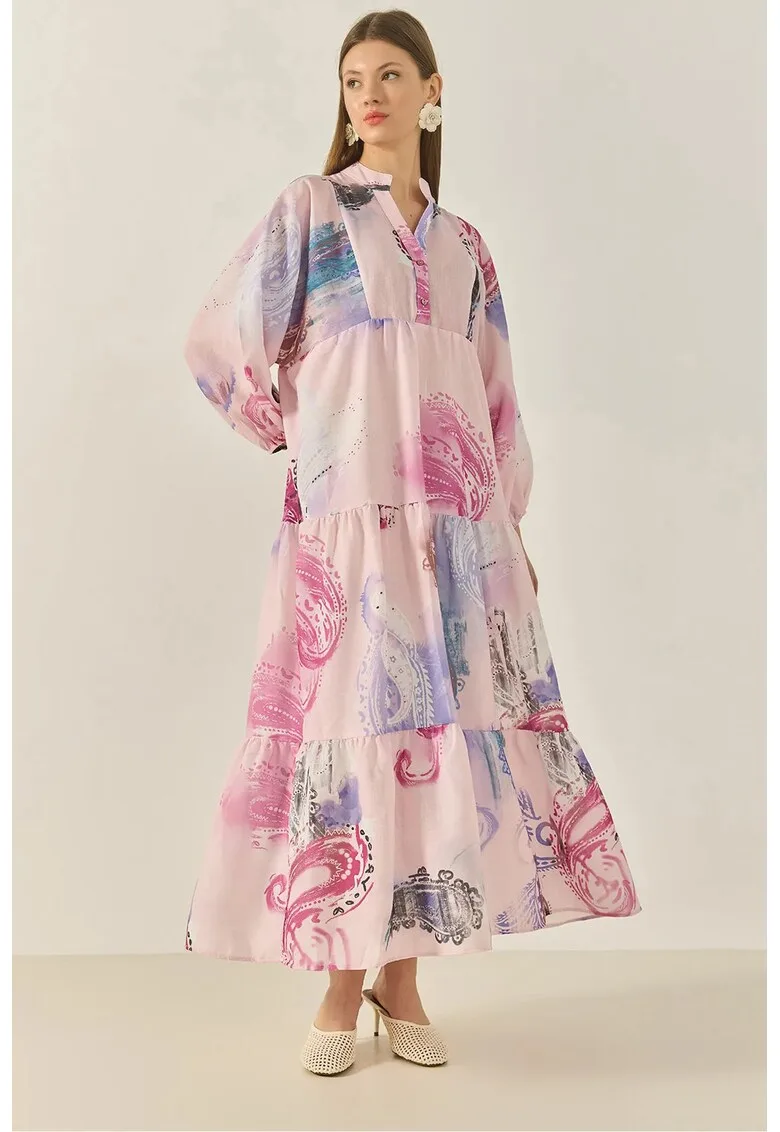Rochie maxi – decolteu in V – detalii cu volane – roz – poliester – – Reduceri Exclusive
