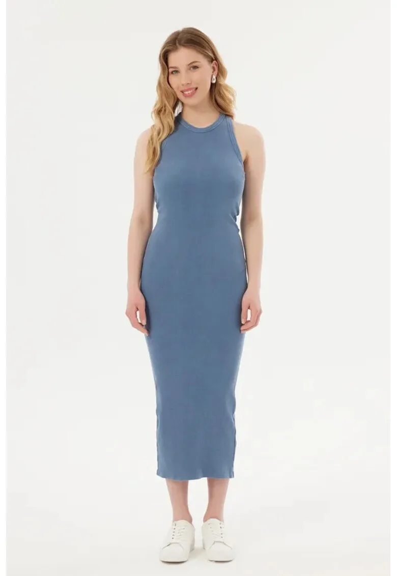 Rochie maxi – fara maneci – guler rotund – albastra – textil