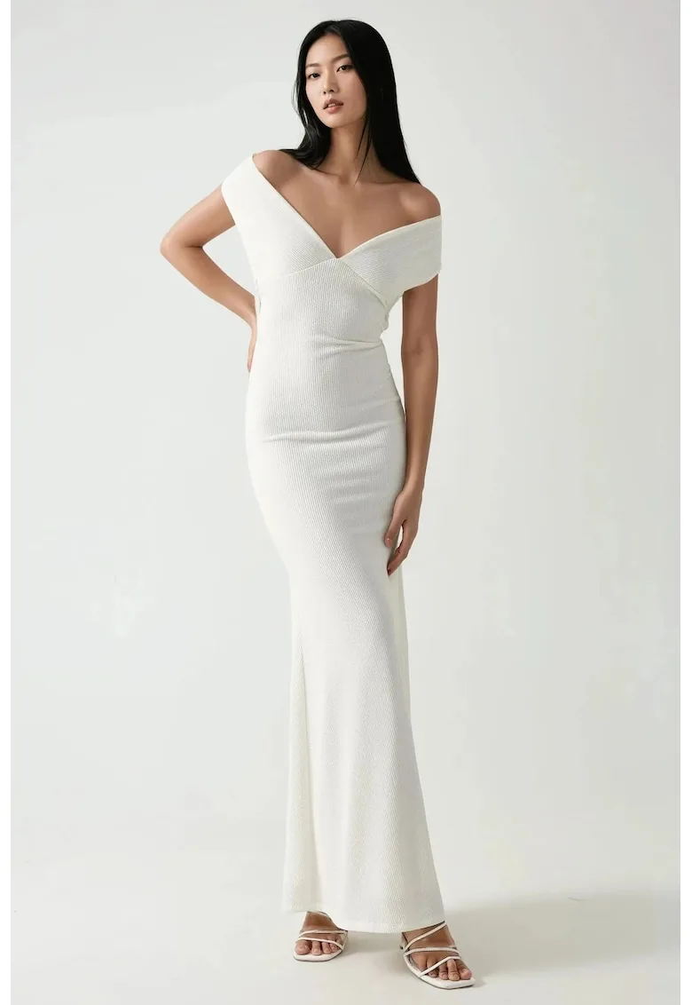 Rochie maxi – guler in forma de inima – design texturat – alb – Reduceri Exclusive