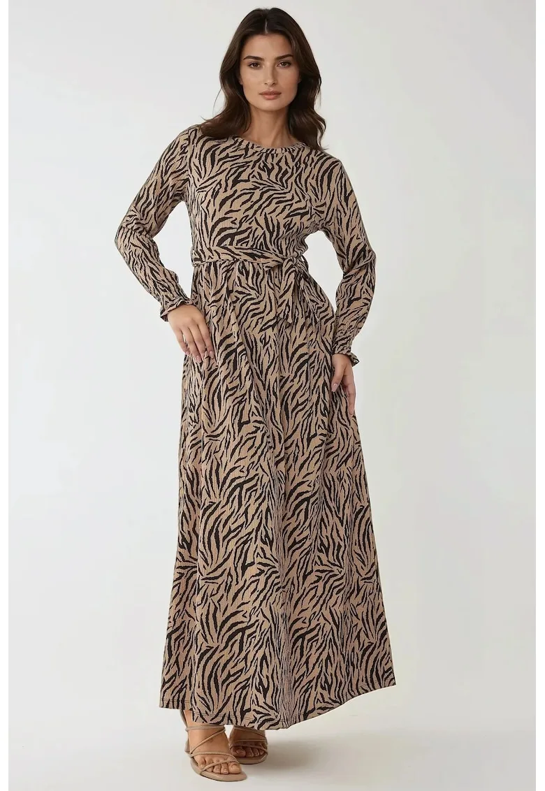 Rochie maxi – guler rotund – imprimeu – maro – Reduceri Exclusive