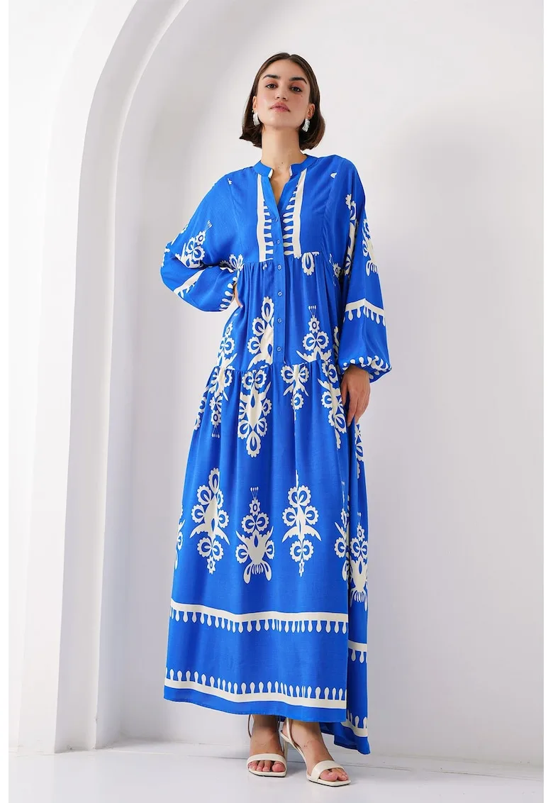 Rochie maxi HiCCUP BDART – decolteu in V – captusita – textil – albastru – Reduceri Exclusive