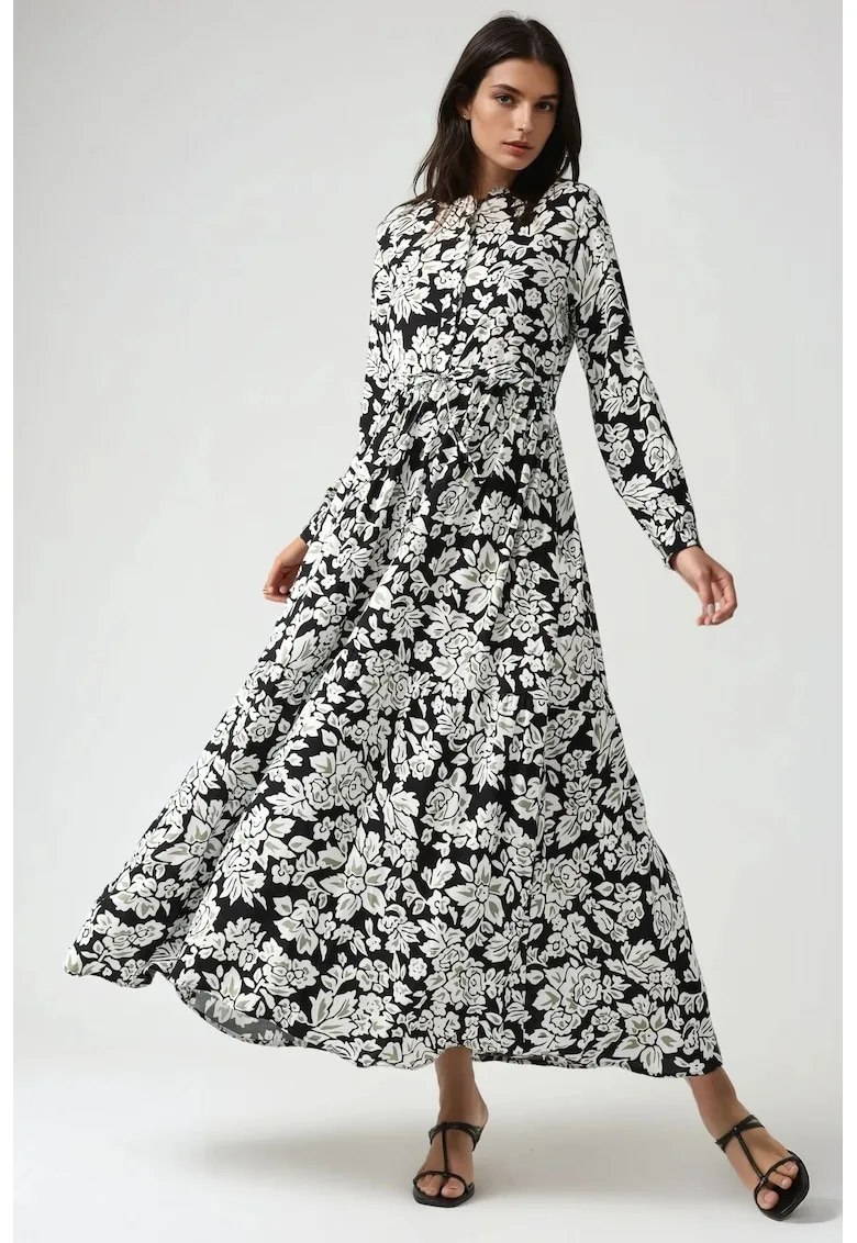 Rochie maxi – imprimeu – cu guler camasa – negru – fabrica