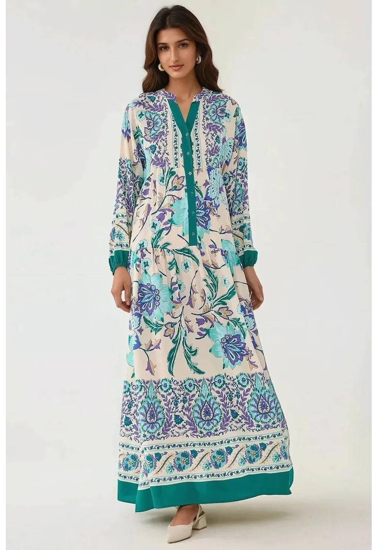 Rochie maxi – imprimeu – cu maneca lunga – verde – viscoza – Reduceri Exclusive