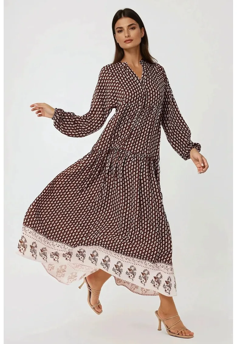 Rochie maxi – imprimeu – decolteu in V – maro – textil – Reduceri Exclusive