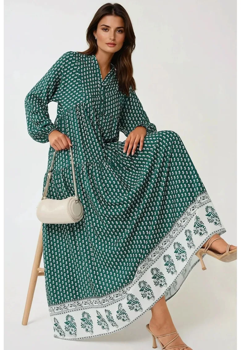 Rochie maxi – imprimeu – decolteu in V – verde – textil – Reduceri Exclusive
