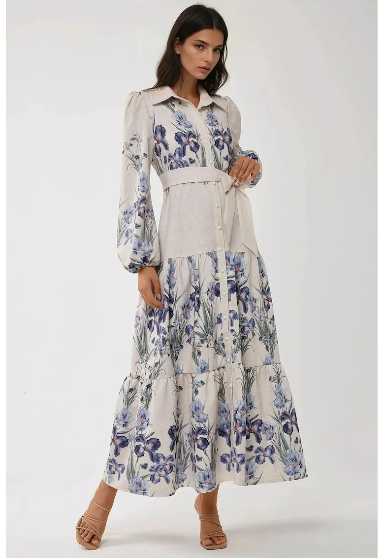 Rochie maxi – imprimeu floral – alb – albastru – lycra