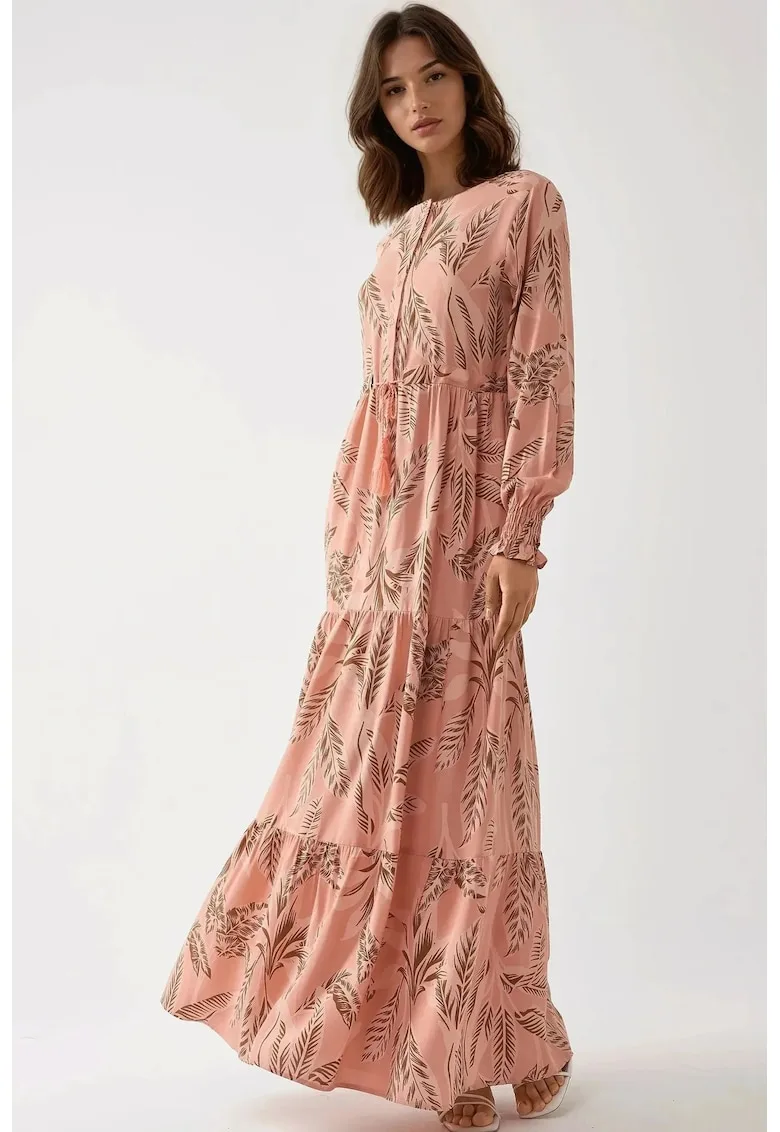 Rochie maxi – imprimeu frunze – roz – viscoza – Reduceri Exclusive