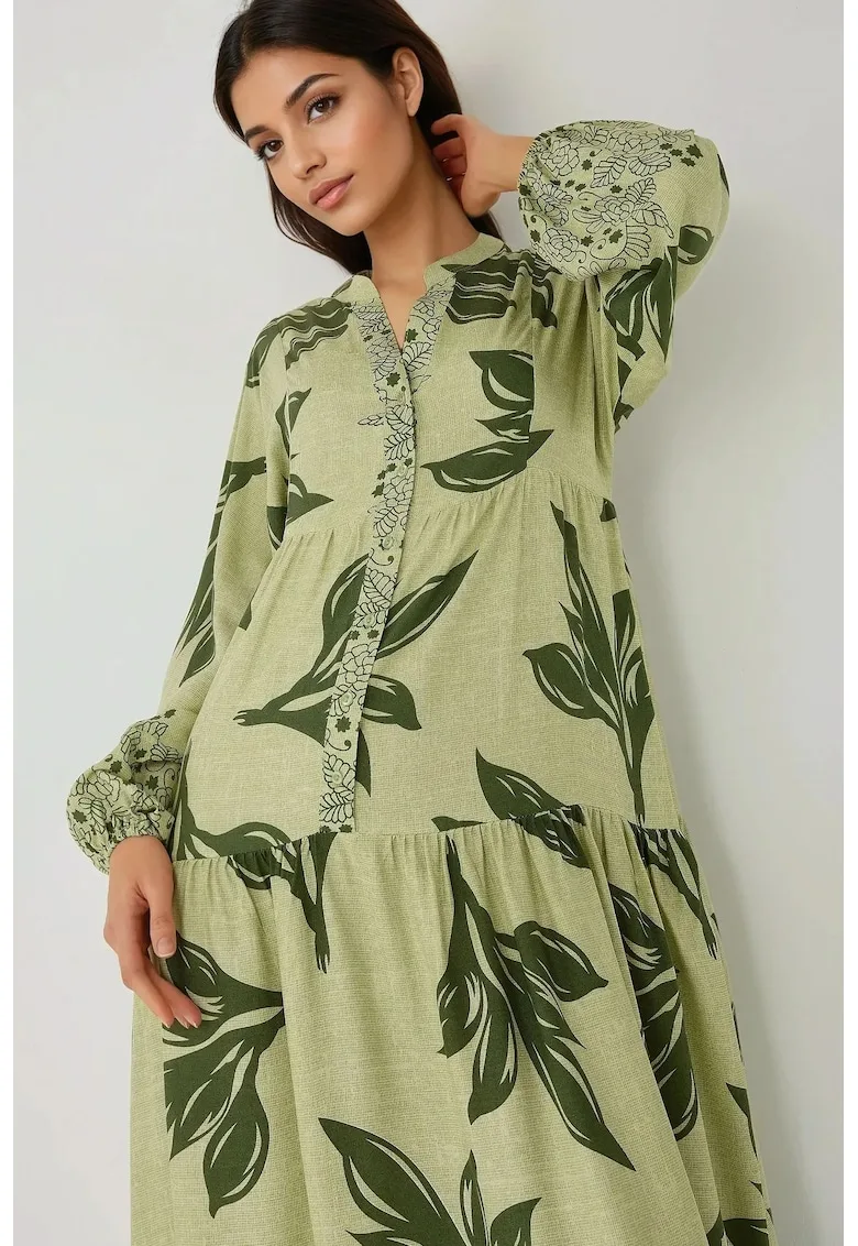 Rochie maxi – imprimeu frunze – verde – viscoza – Reduceri Exclusive