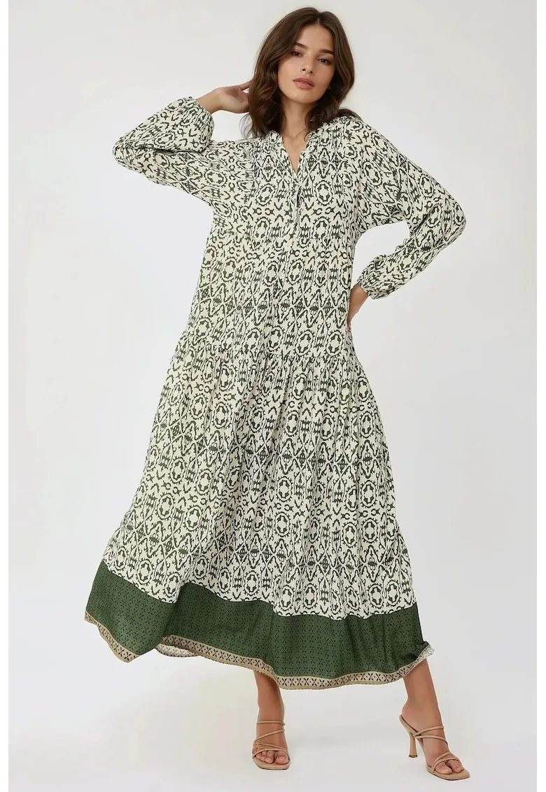 Rochie maxi – imprimeu – guler camasa – verde – textil – Reduceri Exclusive