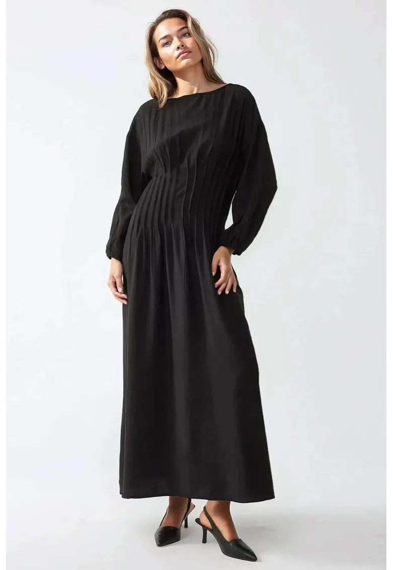 Rochie maxi – maneca lunga – guler rotund – neagra – jerseu